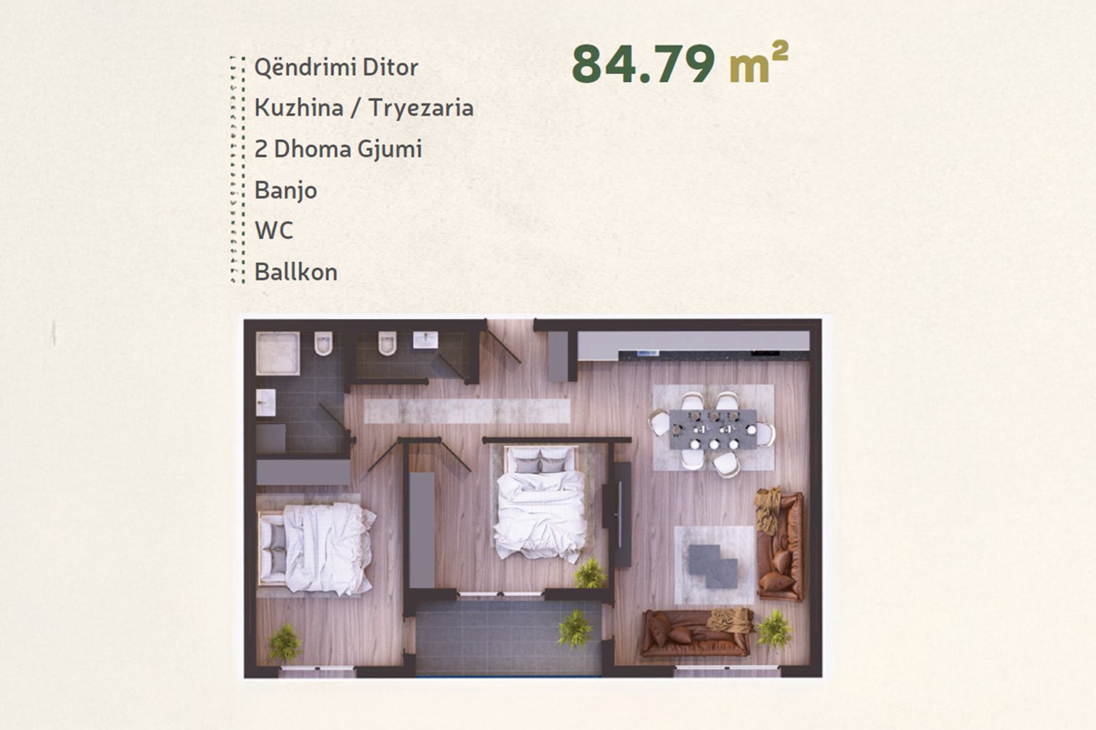 Sipërfaqe: 84.79 m² Dhomat e gjumit: 2 Tualete: 2